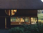 Das Erdgeschoss ist ein grosser Raum, 75 cm in die Erde vergraben, verglast und allseitig mit einem tisch-hohen Möbel umgeben. Dieser leicht vertiefte, horizontale Raum ist Wohnraum, Essraum, Küche, Spielraum und Büro – der Gemeinschaftsraum. Man steht in einer Wiese.