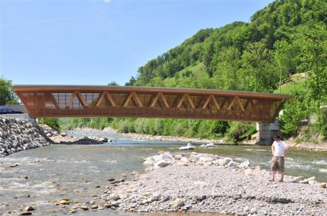 Gedeckte Holzbrücke aus zwei Fachwerken und einer grossformatigen Mehrschichtplatte als Fahrbahnunterbau.