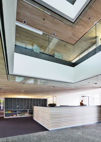 Der Holzsystembau mit grossen Räumen und wenig Stützen (Stützenraster 6,0m x 7,0m) ist sehr flexibel in der Raumgestaltung, da die Holz-innenwände nichttragend sind. Holzbeton-Verbunddecken (HBV) mit maximaler Spannweite von 7 Meter lagern im Innern des Neubaus in Stahlunterzügen, welche wiederum auf ausbetonierten Stahlstützen aufliegen.