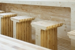 Ein massiver, stufenhoher Sockel gleicht das bestehende Gefälle im Hallenboden aus und bildet im direkten und übertragenen Sinn eine Plattform für die Gesellschaft der Benützenden. Fünf Zentimeter dicke Brettschichtplatten aus Fichtenholz werden maschinell so in Form gefräst, dass die ausgeschnittenen Teile nach der präzisen seriellen Fügung und Verschraubung in ihrer Gesamtheit das Raummöbel ergeben. Die Oberflächen sind geschliffen und geölt, sämtliche technischen Elemente wie Tischleuchten, Abfalleimer und Ablageregale sind aus schwarz passiviertem Stahlblech gefertigt und die verglasten Vitrinen sind beleuchtet.