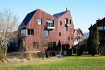 Eingebunden in eine Siedlungsstruktur von historischen Gebäuden, wirkt das neue Dreifamlienhaus als selbstbewusster Baustein in der Kernzone von Oberrieden. Die schmale, vom Butzenbach durchschnittene Parzelle und die unterschiedlichen Lagequalitäten des Grundstückes bilden die Basis der Gebäudedisposition. Im Kontext der gewählten Volumetrie und des in Oberrieden nach wie vor typischen Nebeneinanders von meist hellen Steinhäusern und dunklen Holzscheunen lag ein Haus in Holzbauweise nahe.