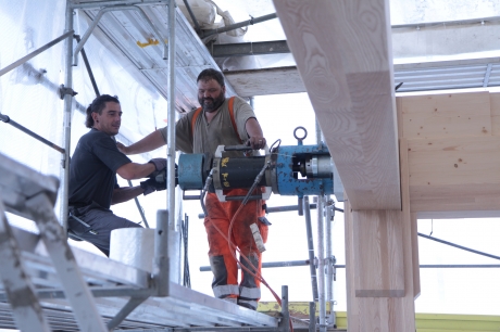 Die Vorteile des innovativen Konstruktionsprinzips liegen auf der Hand: Der hohe Vorfertigungsgrad ermöglicht einen einfachen und schnellen Aufbau vor Ort. Dank Skelettbau lassen sich die Grundrisse frei einteilen und die Fassade fugenlos, transparent und grossflächig gestalten. Ein Geniestreich liegt indes in den Vorspannkabeln im Innern der Träger. Dank der Zugkraft von 70 Tonnen erhöht sich die Steifigkeit der Struktur. Gleichzeitig wird eine so genannte Rückstellkraft mobilisiert: Falls sich der Ske-lettbau bei einem Erdbeben verformt, findet er durch die Zugspannung von selbst in die ursprüngliche Form zurück.