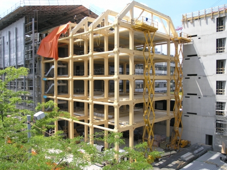 Im Zentrum Zürichs, unweit des Hauptbahnhofs, zeigt seit Mai 2013 ein visionäres Bürogebäude das Potenzial des Materials Holz auch für grossvolumige urbane Bauten. Der Pritzker-Preisträger Shigeru Ban ist mit seinen markanten Holzkonstruktionen ebenso bekannt wie mit seinen humanitären Bauten in Krisengebieten. Das Skelett-Tragwerk sollte ähnlich einem Baukasten zusammengefügt werden, das statische System nachvollziehbar und die Holzelemente unverkleidet bleiben. Eine präzise und innovative Planung, spezielle Hartholzeinlagen, hochwertige Materialien, CNC-Fertigung und ein ausgefeiltes Montagekonzept machten es möglich, den hohen Ansprüchen der Bauherrschaft und des Architekten gerecht zu werden. rnDas neue Bürogebäude der Mediengruppe Tamedia am Stauffacher in Zürich wurde im Juli 2013 eröffnet. Tamedia strebte mit diesem Projekt ein nachhaltiges Gebäude an, gleichzeitig wollte das Unternehmen einen Beitrag zur Architektur in der Stadt Zürich leisten. Der japanische Architekt Shigeru Ban hat ein einzigartiges Gebäude aus Fichtenholz und Glas entworfen, das rund 480 Mitarbeitenden eine hohe Arbeitsplatzqualität bietet. Das neue Medienhaus von Tamedia ist das erste Gebäude von Shigeru Ban in der Schweiz.
