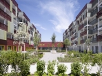 Zwei sechsgeschossige Längsbauten, die in Nord-Süd-Richtung orientiert sind, umfassen zusammen mit zwei niedrigen Querbauten einen Hof. Im Erdgeschoss beleben vielfältige öffentliche Nutzungen die Wohnsiedlung. In den Wohnungen bilden Eingangsbereich, Erschliessung, Wohn- und Esszimmer eine durchgehende Raumfigur, die sich ein- oder zweiseitig zu den Fassaden öffnet. Die im Grundriss mäandrierenden Loggien sind als vorgelagerte Gartenzimmer zu den Wohnungen ausgebildet. Als durchgängig begehbare Raumschicht prägen sie das Fassadenbild der vier Längsseiten. Alternierend sind sie durch stellenweise zweigeschossig angeordnete Öffnungen so unterbrochen, dass ein Spiel zwischen ein- und zweigeschossigen Bereichen entsteht. Zusätzlich schaffen die farbigen, horizontal gestaffelten Holzlamellen der Brüstungen zusammen mit vertikalen Schiebeelementen bewegte und oszillierende Aussenräume.