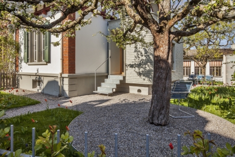 Anbau an ein Doppeleinfamilienhaus unter Denkmalpflege. Als Modul mit Einbauten versehen, im Schuler Holzbausystem (Blockholzplatten) in einer Zimmerei vorgefertigt und vor Ort eingekleidet mit Holzschindeln.