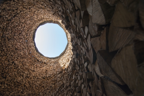 Im Auftrag des Kunstmuseums Thurgau entwickelte der japanische Künstler Tadashi Kawamata zusammen mit dem Architekten Christophe Scheidegger ein Kunstobjekt für den Aussenraum des ehemaligen Klosters Kartause Ittingen. Ausgangspunkt des Experimentellen Projektes waren die Holzstapel um den Parkplatz der Kartause, wo die Holzernte des Winters 2012/2013 aus den Wäldern um die Kartause trocknet.rnrnAnstatt das Holz wie üblich in Form von Scheiterbeigen zu lagern, schlug der Künstler vor, die 170 Ster einer Jahresernte zu einem Turm zu stapeln. Wichtiger als das Endprodukt Turm oder gar sein Nutzen als „Trocknungsmaschine“ ist für den Künstler der Entwicklungsprozess. Daher ist der „Scheiterturm“ kein Monument mit Ewigkeitsanspruch, sondern als vorübergehendes Ereignis dem Verwertungskreislauf untergeordnet: das künstlerische Ausgangsmaterial wird nach zwei Jahren als Brennholz verkauft und verfeuert. Für das Kunstprojekt Kawamatas sind die Prozesse wesentlich, die eine veränderte Wahrnehmung des Kultur- und Begegnungsorts Kartause Ittingen bewirken und in deren Verlauf das Absurde und (beinah) Unmögliche gedacht, auf Umsetzungsmöglichkeiten überprüft und gemeinsam realisiert wurde.rnrnFür die Umsetzung verantwortlich war der Architekten Christophe Scheidegger in Zusammenarbeit mit dem Holzbauingenieur Markus Zimmermann. Während dem Bau innerhalb von 2 Wochen leisteten Studenten der Ecole des Beaux-Arts von Paris und die die Mitarbeiter des Heim- und Werkbetriebes die arbeitsintensive Aufschichtung des Stapels.rnrnDer Scheiterturm ist Werbeträger für Holz und Kunst gleichzeitig. Im Innern des Turmes entstand ein Raum wo 100 Tonnen Laubholz spürbar, riechbar und erfahrbar werden.rn