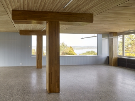 Leichtbau in Holz: Flachdecken 150mm aus Brettsperrholz, Stützen 360x360mm in Fichte mit Ummantelung in Eiche, Sattelhölzer in Eiche, Aussenwände in Elementbauweise, Innenverkleidung Fichtentäfer, Fassadenschalung vorvergrautes Fichtenholz
